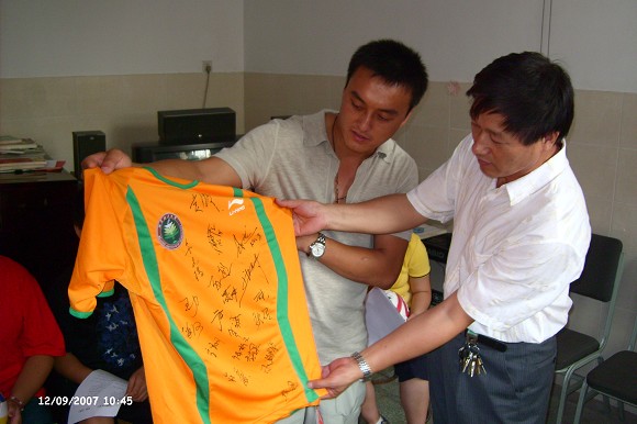 在活動的最后,我校足球隊黨支部輔導員付大軍老師將一件由全體教練員、隊員簽名的主場比賽服作為禮物贈送給該校校長,表示足球隊黨支部以及團支部將和該校建立長期的互動關系,使每一位球隊成員都能用自己的愛心來關心、幫助殘疾人和弱勢群體。