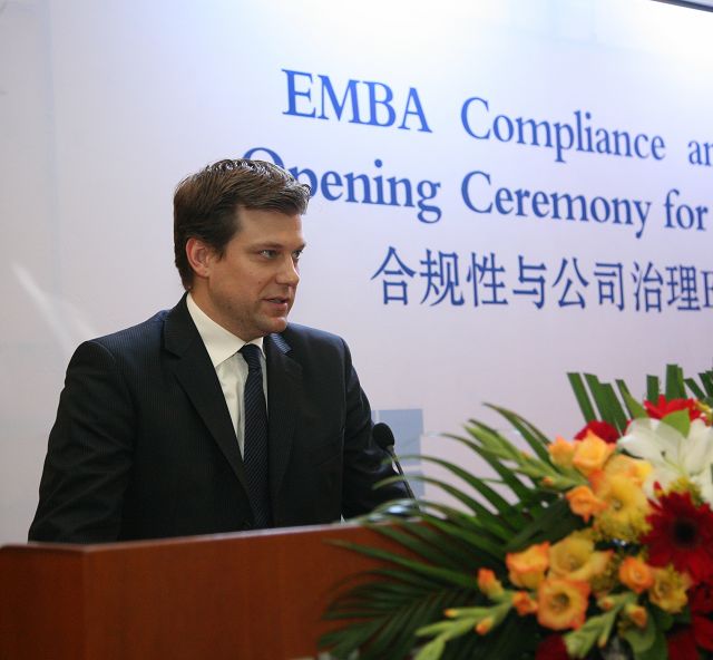 戴姆勒中國卡車公司總裁兼首席執行官Gerrit Marx博士致辭。他首先歡迎大家出席典禮,Gerrit Marx博士的致辭,對 “合規性與公司治理”高級工商管理碩士班的創辦與發展給予了高度評價,指出學校與企業合作是學校企業共同發展的需要。Gerrit Marx博士說:“貴校與德國兩所大學合作為戴姆勒公司舉辦EMBA班項目,是把全球最佳實踐融入一個定制項目之中,從而滿足在中國成功進行商業活動的需求。第四期學員順利開學,說明了中國已是全球經濟增長最快的國家,中國的經濟發展給教育的優化整合帶來了新的教育市場,校企強強聯合互利雙贏具有重要的現實意義和戰略意義,我們為支持這個項目而感到非常自豪。”
