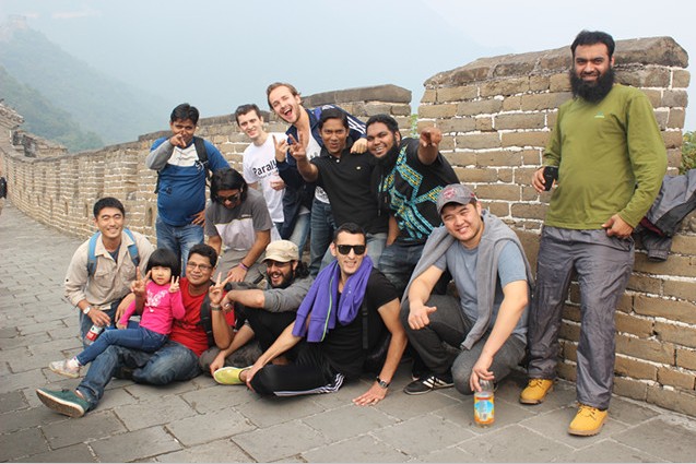 一進入口,同學們就三五成群,結伴而行,好像體內儲存了無限的能量般,想要征服這一眼望不到頭的長城。有的同學體力甚好,才一會兒就甩開其他同學一大截;有的看似人高馬大,卻幾步就氣喘吁吁,看來還須多鍛煉。還有抱小孩爬的,一點兒也不示弱,不得不讓人佩服。來自德國的留學生安妮表示,慕田峪長城給了她很大的驚喜,這里的人沒有八達嶺那么多,風景卻毫不遜色。印尼留學生拉卡既不想落在最后,又怕錯過美景,一路上可忙壞了,一會兒跟朋友拍幾張,一會兒小跑幾步,還不忘跟老師們也合個影。幾個巴基斯坦的學生每走到標志性建筑旁,都要集體擺各種pose拍照紀念,再好吃好喝一通,然后繼續行進。