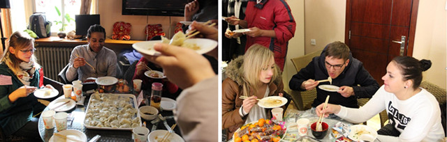 When making dumplings, students assisted with teachers to wash dishes, make stuffing, and learnt to make dumplings. For most of students, this is their first time to make dumplings, so they are all very excited. When the dumplings were well cooked, all the students couldn’t wait to have a try. Everyone gathered in front of the TV, to appreciate the brilliant performance of 2013 Spring Festival Gala while eating dumplings.
