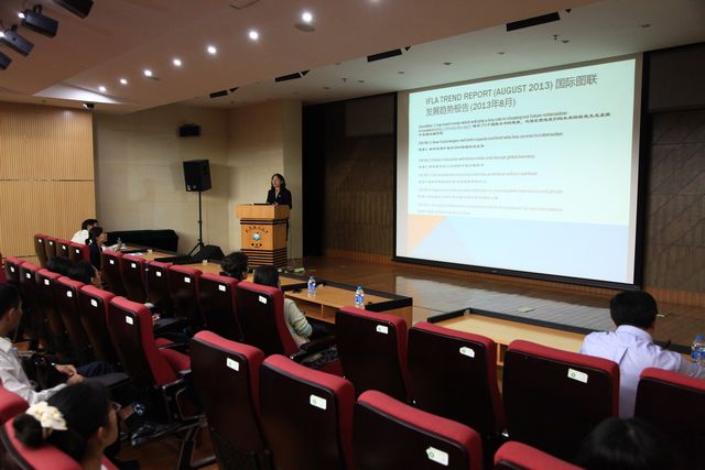 2013年9月17日上午,“中美高校圖書館發(fā)展與國際交流合作”研討會(huì)在我校圖書館報(bào)告廳召開,邀請(qǐng)了美國伊利諾大學(xué)厄巴那-香檳分校(UIUC)伊州消防服務(wù)培訓(xùn)學(xué)院圖書館館長和該院中國國際合作項(xiàng)目負(fù)責(zé)人阮煉博士做專題報(bào)告,來自清華大學(xué)、北京大學(xué)、北京航空航天大學(xué)、北京科技大學(xué)等高校圖書館30余人參加了研討會(huì)。研討會(huì)由圖書館副館長崔宇紅主持。
