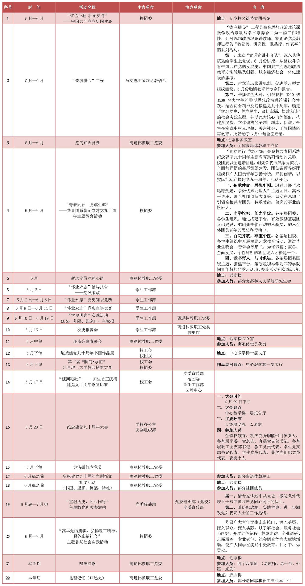 為慶祝中國共產黨建黨九十周年,學校各單位組織開展了相關活動。學校辦公室現將各單位活動匯總公布,歡迎全校師生踴躍參加。