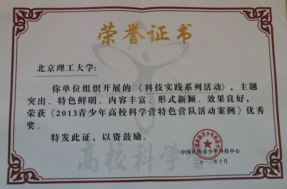 北理工榮獲《2013青少年高??茖W營特色營隊活動案例》優秀獎