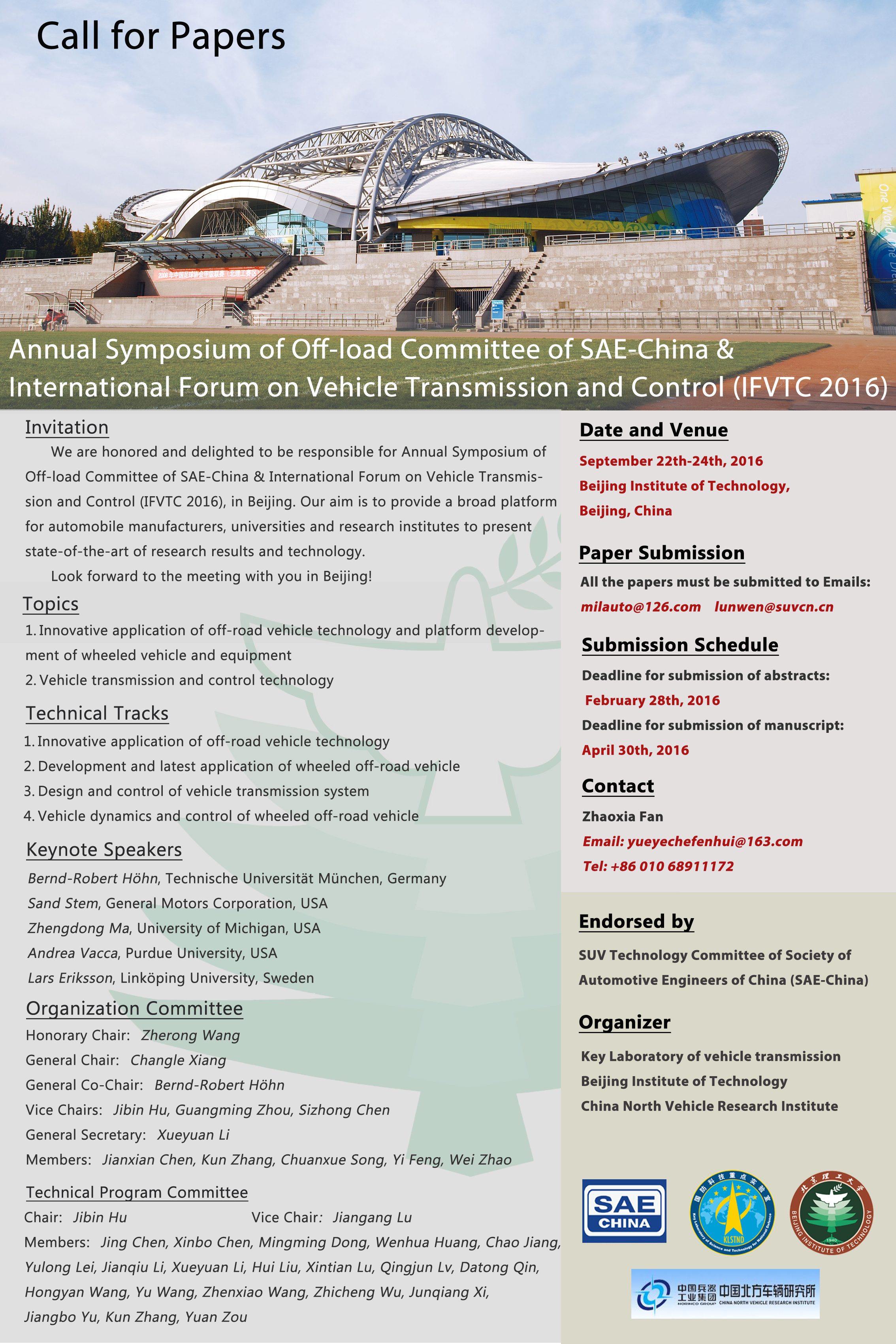 由中國汽車工程學會越野車技術分會主辦,車輛傳動重點實驗室、北京理工大學、中國北方車輛研究所承辦的“2016中國汽車工程學會越野車技術分會學術年會暨車輛動力傳動與控制國際論壇”將于2016年9月22-24日在中國?北京舉辦。本次活動將采取主旨報告、專題論壇、分論壇交流、車輛裝備展示和實地參觀考察等形式進行。現就此次活動安排及征文有關事宜通知如下: