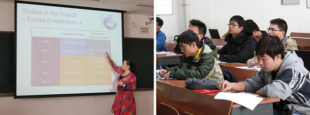 此外,圖爾大學(xué)工程師學(xué)院、奧爾良大學(xué)工程師學(xué)院分別詳細(xì)反饋了我校歷屆學(xué)生在法國的學(xué)習(xí)情況,項(xiàng)目運(yùn)行良好。我校自2008年開展了本項(xiàng)目,先后有68名同學(xué)參加項(xiàng)目,2013年9月將有11名同學(xué)赴法學(xué)習(xí)。當(dāng)天下午1:00,圖爾大學(xué)工程師學(xué)院的老師為我校學(xué)生介紹了赴法訪學(xué)及讀研項(xiàng)目,以及圖爾大學(xué)工程師學(xué)院和奧爾良大學(xué)工程師學(xué)院的相關(guān)情況,并回答同學(xué)們的問題。