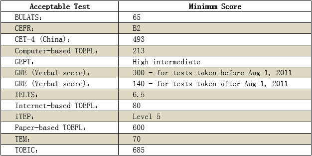 注:表格中列出的CET(China)指的是全國大學英語四級(或六級)考試。我校教務處提供iTEP考試服務,缺少英語成績的同學如要報名,教務處將統一組織考試。
