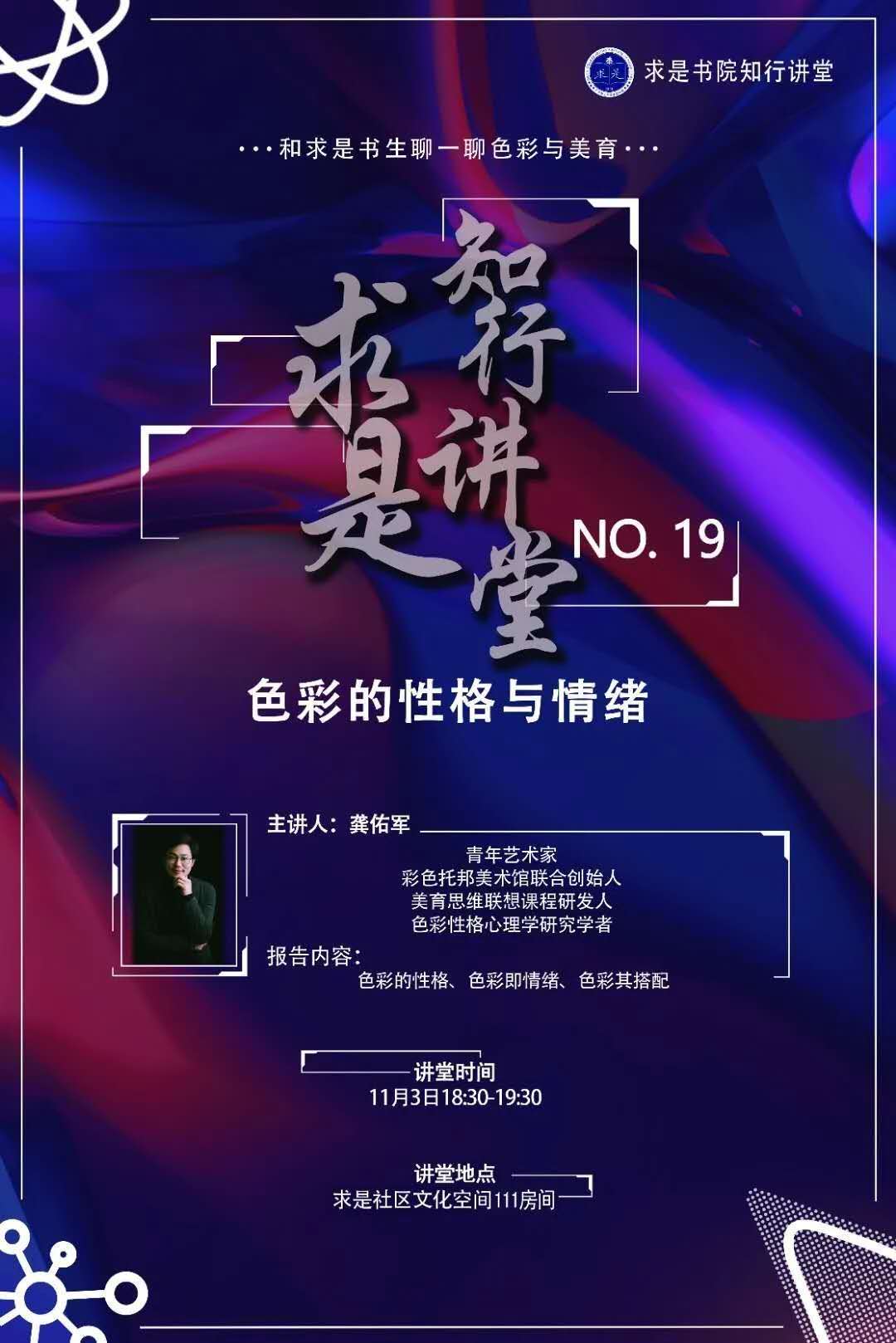 近日,求是書院在求是社區舉辦求是知行講堂活動,并特別邀請到了青年藝術家、彩色托邦美術館聯合創始人、色彩性格心理學研究學者龔佑軍老師為大家帶來了一場精彩的講座。講座由汪建宇老師主持,求是書院副院長周芳集出席講座。