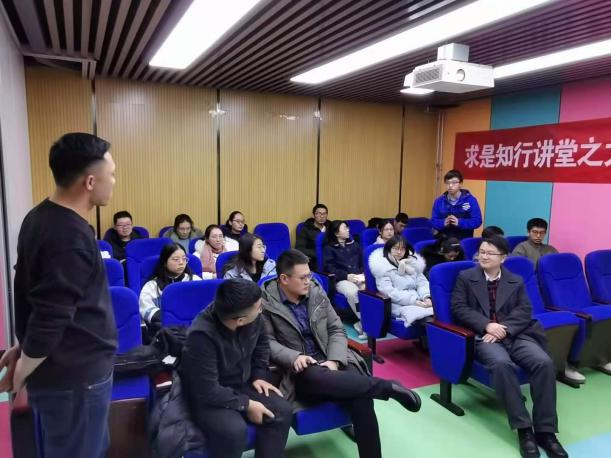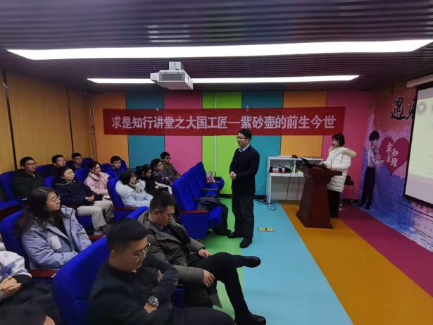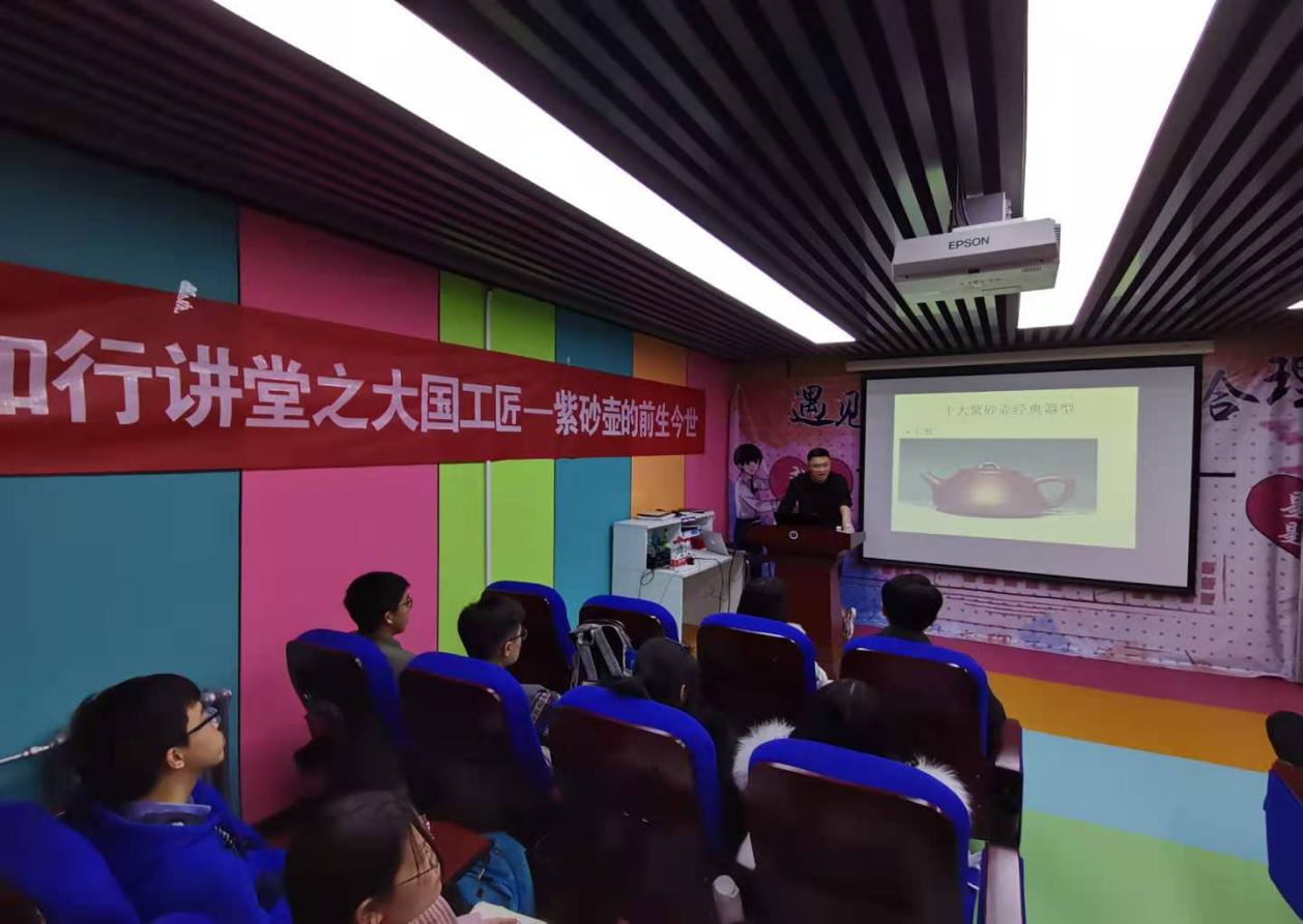 12月3日晚,北京理工大學求是書院知行講堂第十二講在良鄉校區求是社區111房間舉行。美術大師胡洪明的、兩位親傳弟子吳宇翔、潘登先生為求是書生傾情講述紫砂壺的前生今世。求是書院專職副院長周芳集老師、求是輔導員汪建宇、黃曉媛和來自求是書院的二十余名同學聆聽了講堂。報告會由黃曉媛老師主持。