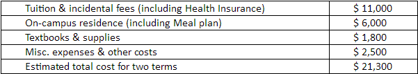 在加拿大滑鐵盧大學學習期間的費用由學生自理。每學期的費用估計(加元)如下: