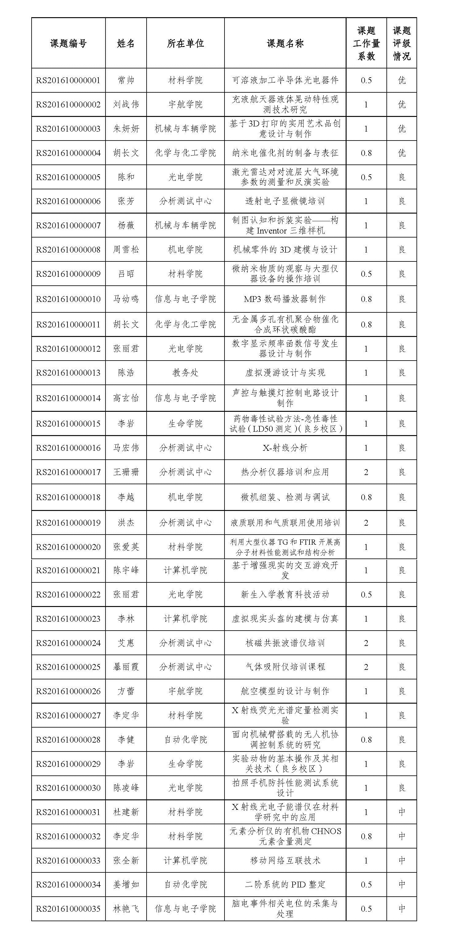 實驗室與設備管理處組織開展了2016-2017學年第一學期(2016年秋季)實驗室開放實驗課題申報工作,經過各位老師自由申報,實驗室與設備管理處組織專家對所申報項目進行評審立項,現將實驗室開放課題學分政策、獲準立項結果、學生選課說明等相關事宜通知如下: