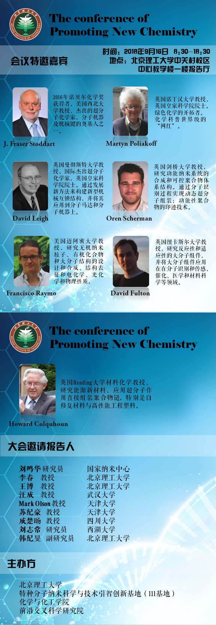 應北京理工大學特種分子納米科學與技術引智創新基地(111基地)、化學與化工學院、前沿交叉科學研究院的邀請,2016年諾貝爾化學獎獲得者、美國西北大學J. Fraser Stoddart教授將于9月16日訪問我校,屆時,將舉辦一場國際學術討論會。同時應邀的還有英國皇家科學院院士,英國諾丁漢大學化學系 Martyn Poliakoff教授、劍橋大學Oren Scherman教授、曼切斯特大學David Leigh教授、美國邁阿密大學Fracisco Raymo教授、英國紐卡斯爾大學David Filton教授、英國雷丁大學Howard Colquhoun教授等著名專家學者,以及國內知名高校和我校的優秀青年學者一起帶來一場學術盛宴。歡迎廣大師生和校友參會。詳情請見會議海報與會議程序冊。