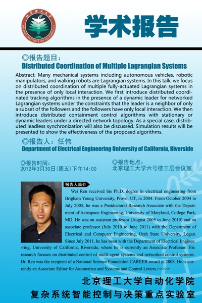 Bio: Wei Ren received his Ph.D. degree in electrical engineering from Brigham Young University, Provo, UT, in 2004. From October 2004 to July 2005, he was a Postdoctoral Research Associate with the Department of Aerospace Engineering, University of Maryland, College Park, MD. He was an assistant professor (August 2005 to June 2010) and an associate professor (July 2010 to June 2011) with the Department of Electrical and Computer Engineering, Utah State University, Logan. Since July 2011, he has been with the Department of Electrical Engineering, University of California, Riverside, where he is currently an Associate Professor. His research focuses on distributed control of multi-agent systems and networked control systems. Dr. Ren was the recipient of a National Science Foundation CAREER award in 2008. He is currently an Associate Editor for Automatica and Systems and Control Letters .