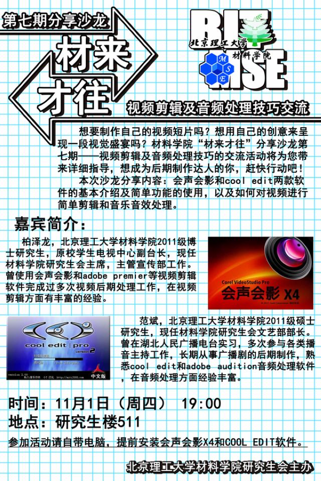 想要創作編輯自己心儀的高清視頻、DV影片嗎?想要精彩而有創意的記錄美好時刻嗎?想用Cool Edit為音頻“繪畫”程序嗎?材料學院“材來才往”分享沙龍第七期——“材料好聲音”視頻剪輯及音頻處理技巧交流將為您帶來詳細指導,想成為視頻、音頻達人嗎?那就趕快行動吧!