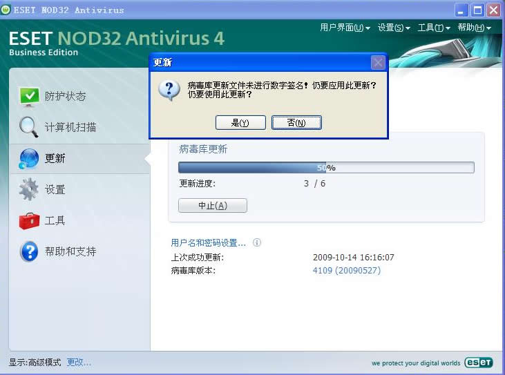 安裝完成之后的第一次病毒庫更新,需要用戶手工進(jìn)行。雙擊NOD32圖標(biāo),在打開的窗口中,點(diǎn)擊“更新”,選擇“更新病毒庫”鏈接。病毒庫更新過程中,可能出現(xiàn)如“病毒庫更新文件沒有數(shù)字簽名”之類的提示,點(diǎn)擊“是”按鈕,繼續(xù)進(jìn)行升級即可。