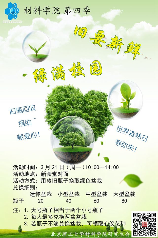 廢瓶太多怎么辦?扔掉?NO!快來參加材料學院第四季“舊要新鮮 綠滿校園”環保公益活動,我們會為廢瓶們尋找合適的去處。在“世界森林日”來臨之時,用廢舊瓶子換取心儀盆栽, 讓環保從你我身邊做起。