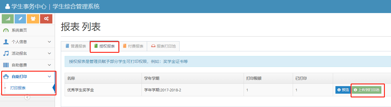 第一步: 需自助打印證書(shū)學(xué)生請(qǐng)?jiān)?/span>http://ssc.info.bit.edu.cn/單點(diǎn)登錄,進(jìn)入如下界面,點(diǎn)擊自助打印——打印報(bào)表——選擇要打印的獎(jiǎng)項(xiàng)上傳到打印池;
