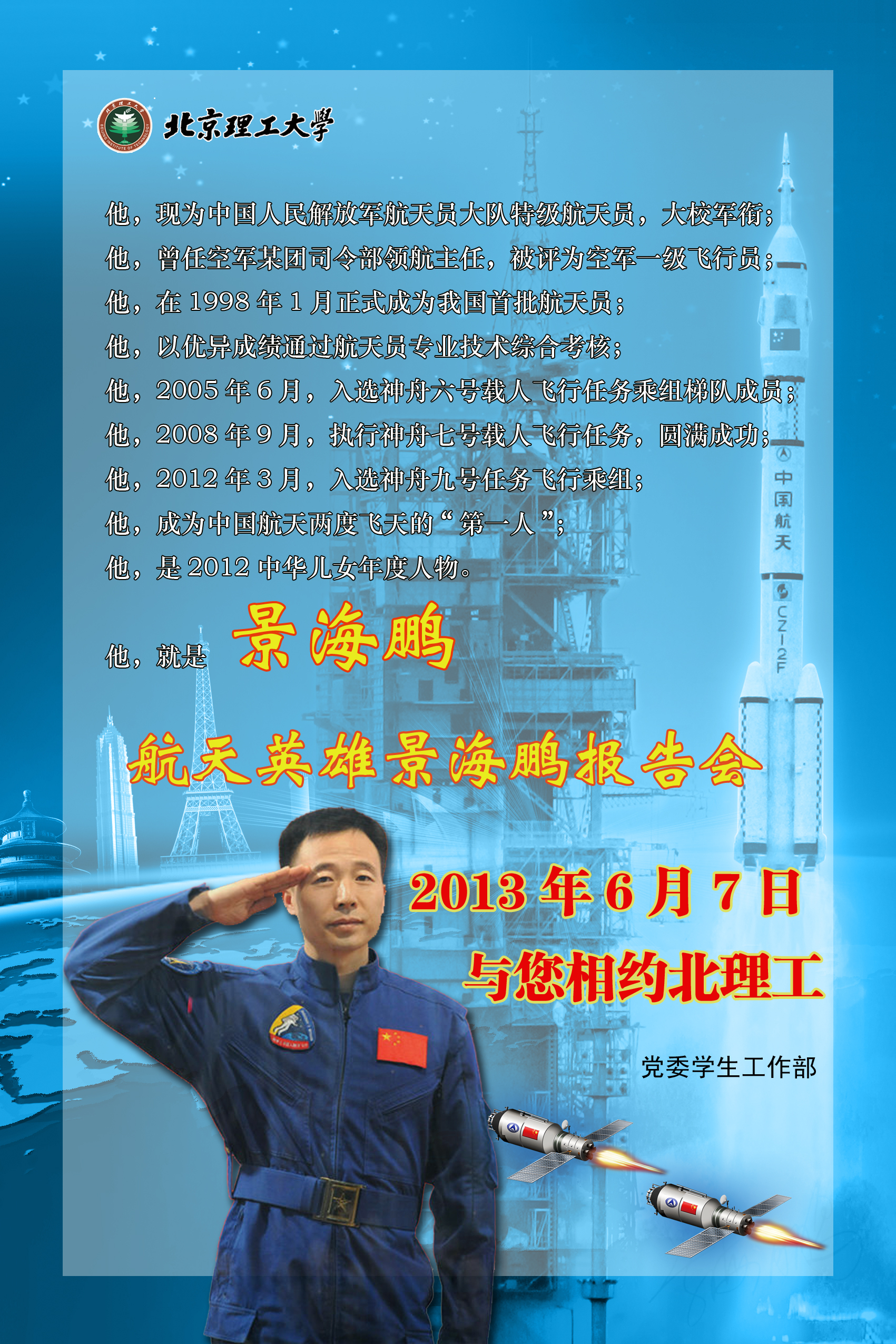 景海鵬,現為中國人民解放軍航天員大隊特級航天員,大校軍銜。曾任空軍某師某團司令部領航主任,安全飛行1200小時,被評為空軍一級飛行員。1998年1月正式成為我國首批航天員。2005年6月,入選神舟六號載人飛行任務乘組梯隊成員。2008年9月,執行神舟七號載人飛行任務,獲得圓滿成功。2012年6月,入選神舟九號載人飛行任務乘組。他由此成為中國航天兩度飛天的“第一人”。2012中華兒女年度人物。