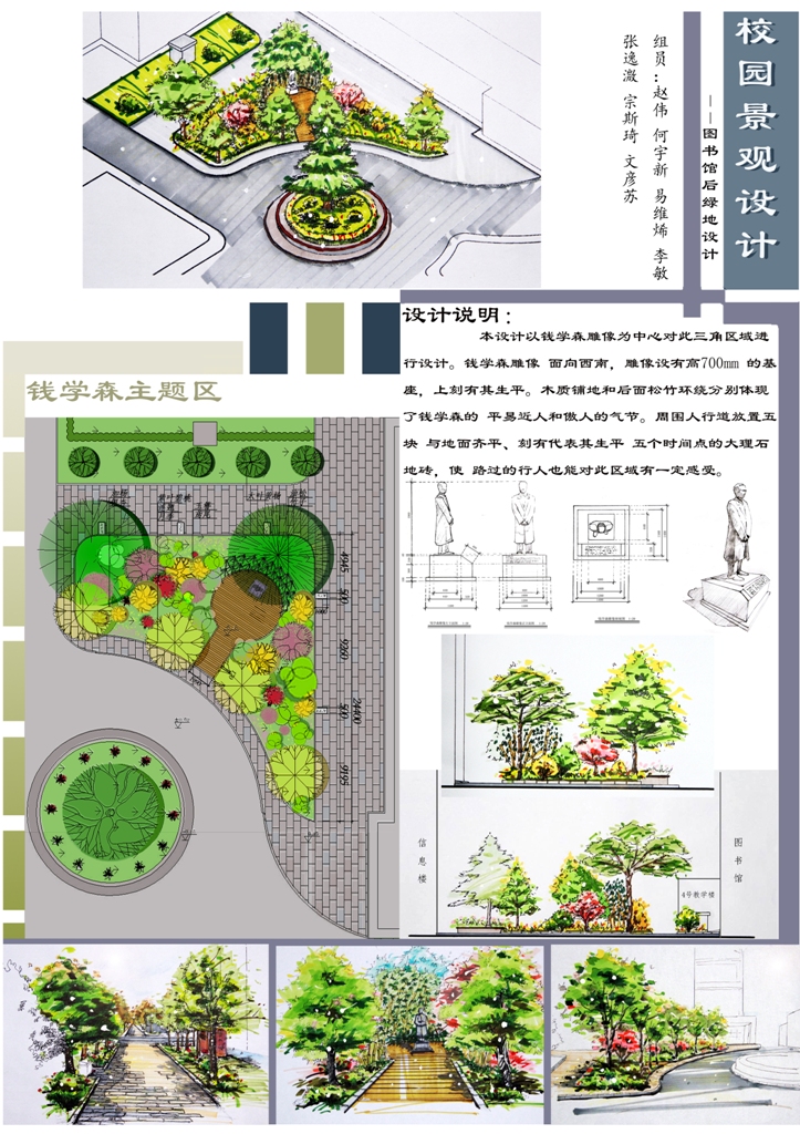 本次展出的方案,作者均為設計學院環境藝術設計系2010級本科生,在專業老師的指導下,學生們將校園景觀改造與城市公共空間景觀設計、植物景觀設計課程學習相結合。在大學生校園景觀需求調研、校園植物分析、錢學森像及周邊環境分析的基礎上,組成七個設計小組分別開展方案設計。所展出的五組方案,通過五個不同方向的設計嘗試——小廣場主題、植物群落主題、微地形主題、時間寓意主題以及思想迸發主題為立意展開錢學森像的遷移改造景觀設計,以求創造美好的校園景觀環境,對北京理工大學的校園景觀改造作出自己的貢獻。