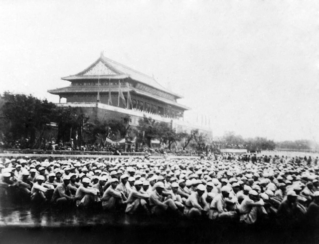 受檢閱的部隊,從東三座門進來, 通過廣場從東向西三座門出去。記得是新組建的人民海軍走在最前面。嶄新的藍白相間的海軍服裝特別醒目。其實是 步兵、騎兵、炮兵、裝甲兵等兵種。其間有十幾架飛機從天安門上空掠過。這些受檢閱的大炮、坦克和飛機都是在抗日 戰爭和解放戰爭中從敵人手中繳獲來的。在檢閱過程中,威武雄壯的人民解放軍受到幾十萬群眾的熱烈歡迎。掌聲和歡呼聲連成了一片,一個高潮接著一個高潮。