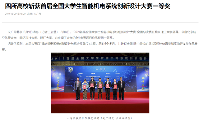 12月8日,“2019首屆全國大學(xué)生智能機電系統(tǒng)創(chuàng)新設(shè)計大賽”全國總決賽在北京理工大學(xué)落幕。來自北京航空航天大學(xué)、國防科技大學(xué)、浙江大學(xué)、北京理工大學(xué)的5件參賽項目作品獲得一等獎。