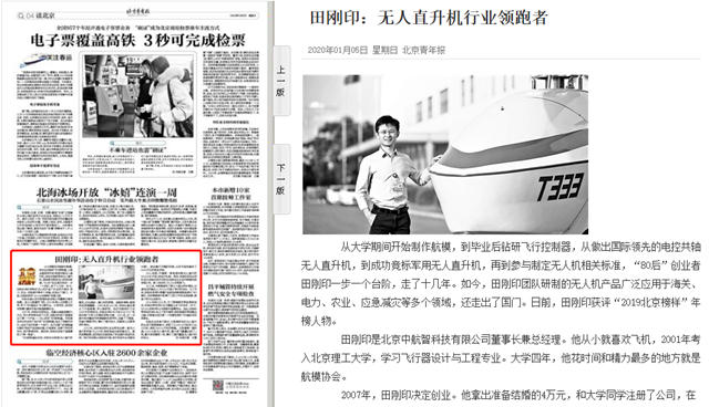從大學(xué)期間開始制作航模,到畢業(yè)后鉆研飛行控制器,從做出國(guó)際領(lǐng)先的電控共軸無(wú)人直升機(jī),到成功競(jìng)標(biāo)軍用無(wú)人直升機(jī),再到參與制定無(wú)人機(jī)相關(guān)標(biāo)準(zhǔn),“80后”創(chuàng)業(yè)者田剛印一步一個(gè)臺(tái)階,走了十幾年。如今,田剛印團(tuán)隊(duì)研制的無(wú)人機(jī)產(chǎn)品廣泛應(yīng)用于海關(guān)、電力、農(nóng)業(yè)、應(yīng)急減災(zāi)等多個(gè)領(lǐng)域,還走出了國(guó)門。日前,田剛印獲評(píng)“2019北京榜樣”年榜人物。