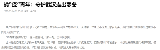 而這個春天,不僅是武漢恢復生機的春天,也是全坤的畢業季。在經歷了疫情之后,全坤告訴記者,自己想做一個對社會有用的人,成為一名國防軍工領域的工程師是他的夢想。“我們學校常教導我們的一句話就是:延安根,軍工魂,國防情,北理夢。把學到的東西學以致用,這是每一個青年人應該做的事。