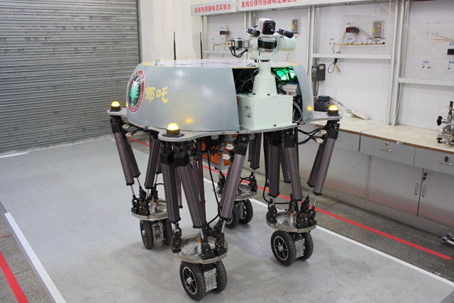 自動化學院運動驅動與控制研究團隊曾在2010年參與了國家“863”計劃項目——液壓四足機器人協同驅動控制研究。課題組的研究生們正是通過對四足機器人的研究,在指導教師的鼓勵和指導下,大膽提出了一個“顛覆”性的技術方案,即將通常使用的并聯式六自由度平臺“上下顛倒”,化“臺”為“腿”,并在“腿上”加裝輪足機構。這一填補了國內外四足機器人研究空白的方案,極具創新性,堪稱“北理工首創”。