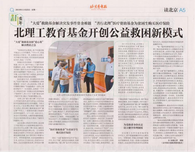 隨著基金系統的不斷完善,目前基金會建立起“大愛救助”基金、“愛心籌”、“善行北理”醫療資助基金三位一體的基金救助體系,救助對象不只面向在校生,無論是入學前、醫保暫時沒有生效的準新生,還是剛畢業、沒有五險一金的畢業生,抑或是畢業多年的校友,只要有著“北理工”的身份,在突患重大疾病和突遭重大變故的時候,都能獲得一定程度的資金救助。