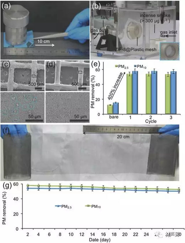 圖4 ZIF-8@塑料網材料表征和去除 PM 性能測試