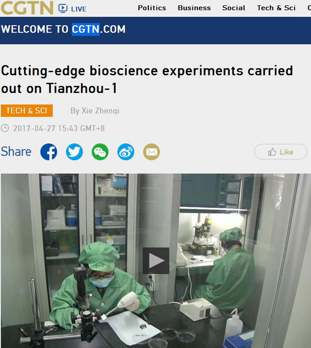 【中國國際電視臺】CGTN報道北理工在天舟一號貨運飛船上進行權威生命科學實驗