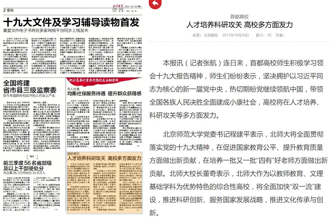 北京師范大學黨委書記程建平表示,北師大將全面貫徹落實黨的十九大精神,在促進國家教育公平、提升教育質量方面做出新貢獻,在培養一批又一批“四有”好老師方面做出新貢獻。北師大校長董奇表示,北師大作為以教師教育、文理基礎學科為優勢特色的綜合性高校,將全面加快“雙一流”建設,推進科研創新、服務國家發展戰略,推進文化傳承與創新。