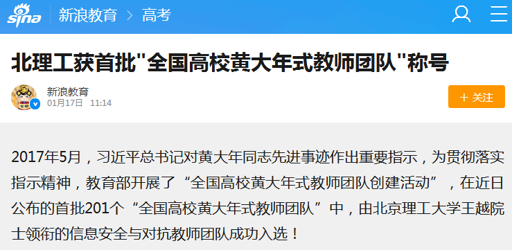 2017年5月,習近平總書記對黃大年同志先進事跡作出重要指示,為貫徹落實指示精神,教育部開展了“全國高校黃大年式教師團隊創(chuàng)建活動”,在近日公布的首批201個“全國高校黃大年式教師團隊”中,由北京理工大學王越院士領銜的信息安全與對抗教師團隊成功入選!