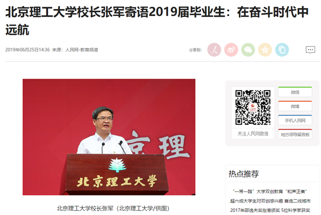 【人民網】北京理工大學校長張軍寄語2019屆畢業生:在奮斗時代中遠航