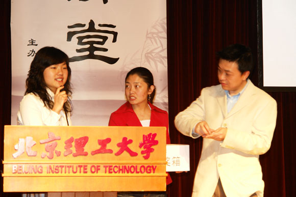 精彩的演講不時贏得大家熱烈的掌聲。在提問環(huán)節(jié),同學們踴躍提問,闡述自己的觀點,董先生都友善而風趣的予以回答。最后,由董路先生抽出了本場講座的幸運觀眾,獲得由董路先生簽名的個人CD和北京愛國者大學生足球隊中甲北理首次主場(本月21日)的入場券。