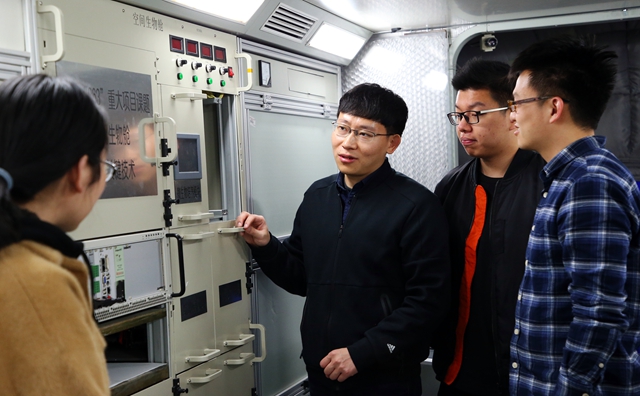 楊春華在空間模擬艙為課題組同學(xué)講解生物實(shí)驗(yàn)平臺(tái)關(guān)鍵技術(shù)