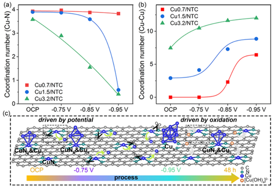 圖1 Cu物種催化劑中Cu–N和Cu–Cu配位數(shù)隨電位的變化以及重構(gòu)、再分散機(jī)制
