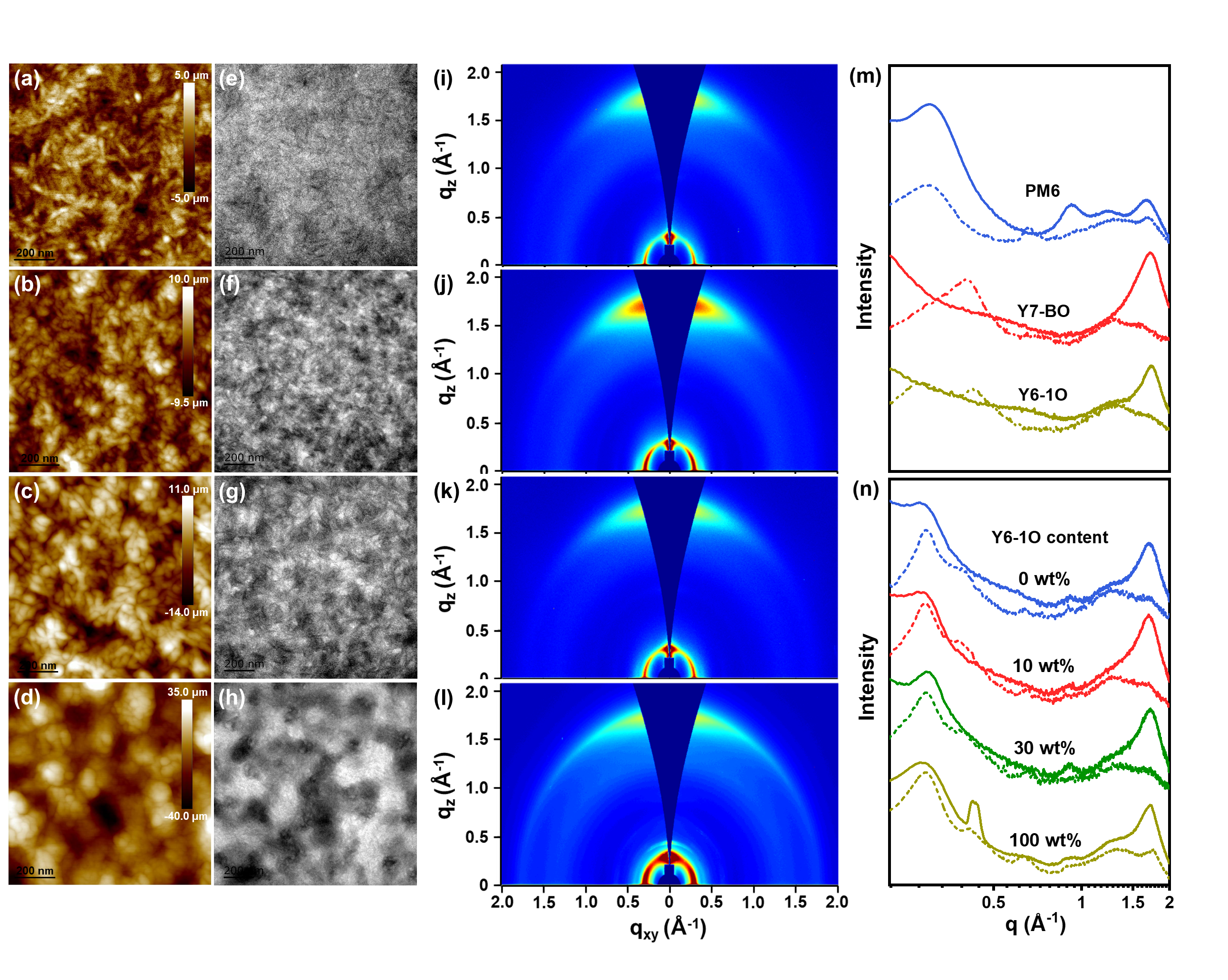 考慮到同源衍生物具有相似的分子結(jié)構(gòu)和良好的兼容性,通過使用同構(gòu)型小分子Y6-1O和Y7-BO作為受體,明星聚合物PM6作為給體來制備高性能三元器件。Y6-1O與Y7-BO具有類似的“BTP”稠環(huán)分子骨架,使得兩個(gè)受體之間具有極好的兼容性,從而有利于精細(xì)調(diào)控三元共混物的形貌以獲得優(yōu)化的短路電流密度和填充因子。另一方面,不同的鹵素取代端基和兩個(gè)受體中不同的不對稱或?qū)ΨQ核心單元能夠提供互補(bǔ)的吸收和可調(diào)節(jié)的能級,這有助于在短路電流密度與開路電壓之間獲得良好的平衡。