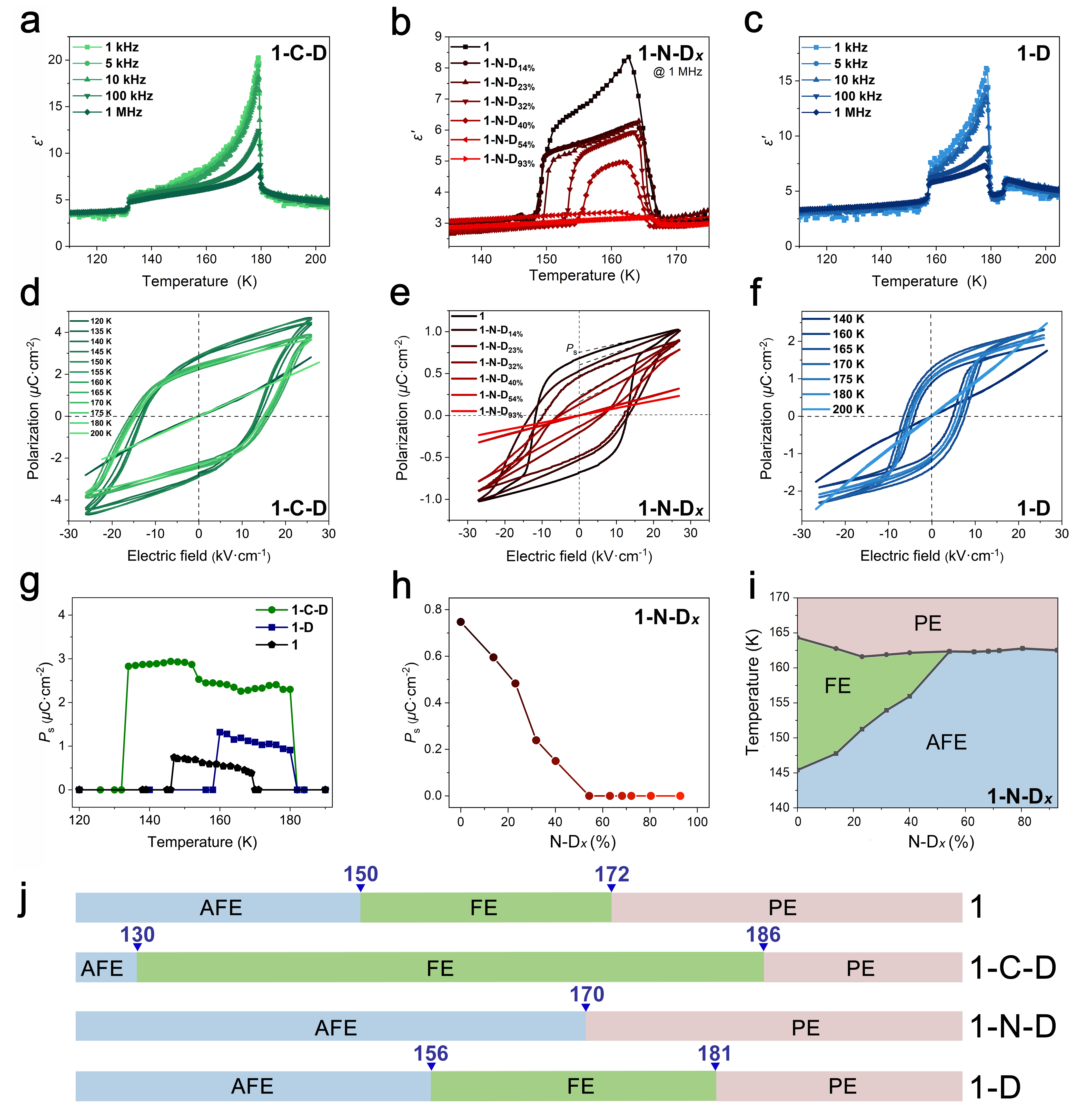 自1931年發現氘同位素以來,氘代被廣泛用于調控材料的化學和物理性質。1942年,研究者發現氘代KH2PO4(KDP)后材料的鐵電相變溫度提高107 K,隨后氘代被進一步研究應用于調控材料的導電、磁性、熒光性質等。在目前已知的研究體系中,顯著的氘代效應發生在伴隨質子轉移的強氫鍵結構中,而對于更為普遍的弱氫鍵體系,氘代效應并不明顯,這個問題極大的限制了氘代在物性調控方面的進一步應用。