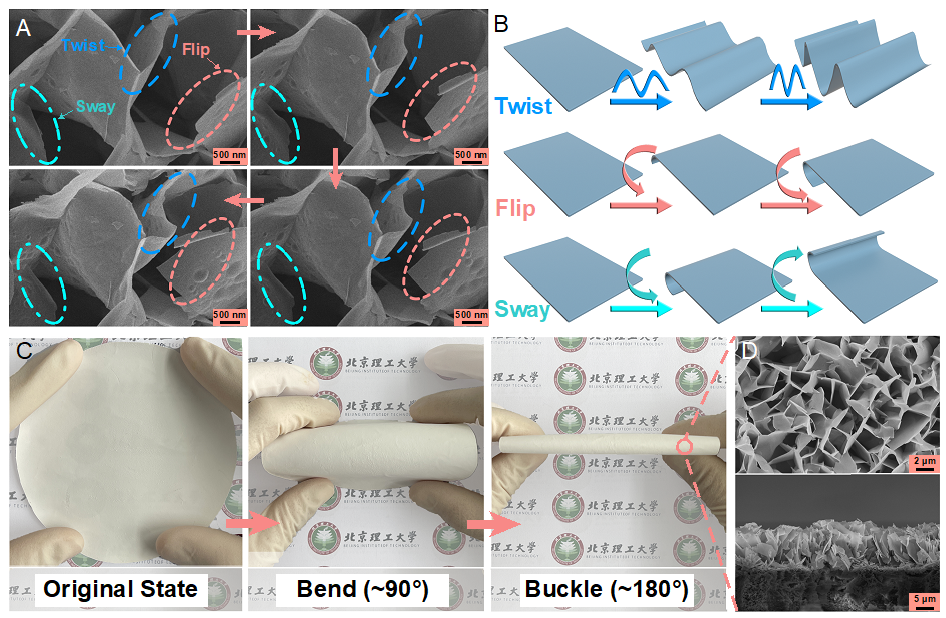 圖3. MOF-NS/PVDF膜的高柔性結(jié)構(gòu): (A)MOF-NS/PVDF膜柔性可逆動(dòng)態(tài)形變過程的SEM圖像(包括翻轉(zhuǎn)、扭轉(zhuǎn)和搖擺);(B)MOF-NS/PVDF膜柔性可逆動(dòng)態(tài)形變示意圖。(C)MOF-NS/PVDF膜的彎曲測(cè)試。(D)MOF-NS/PVDF膜在彎曲后表面和斷面的SEM圖像。