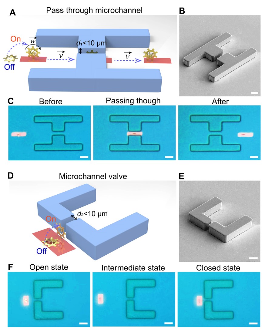 圖4:納米剪紙微型轉子的微通道環境驅動。(A-C)納米剪紙微型轉子在站立狀態下順利通過狹窄微通道(寬度小于10 μm)實驗的示意圖、微通道SEM圖像及驅動實驗圖像。比例尺:20 μm;(D-F)納米剪紙微型轉子在微通道前實現閥門的開放和關閉切換實驗的示意圖、微通道SEM圖像及驅動實驗圖像。比例尺:20 μm。