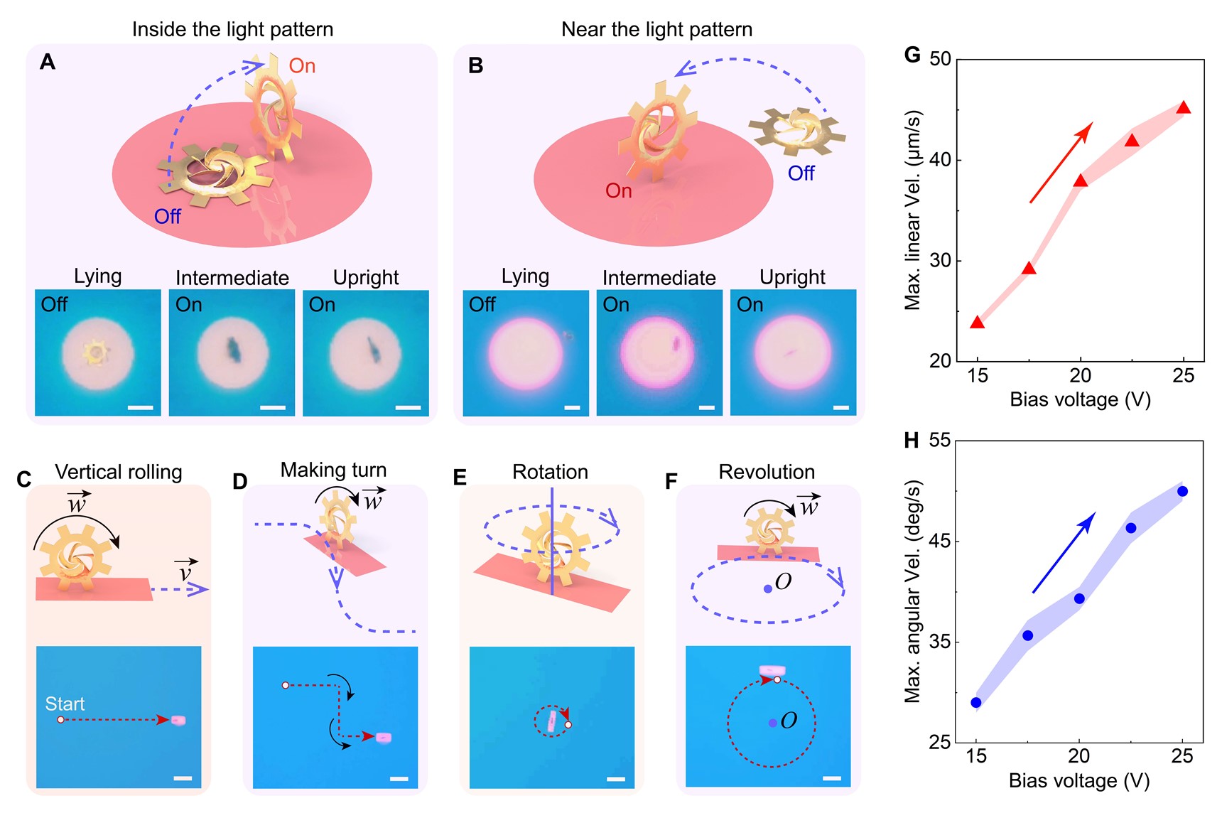 圖3:納米剪紙微型轉子的多模態自由驅動實驗。(A, B)微型轉子的異平面翻轉操控示意圖及相應的實驗捕獲圖像。比例尺:10 μm;(C-F)微型轉子多模態驅動示意圖和實驗圖像,包括垂直滾動、轉向、自轉以及公轉。比例尺:30 μm;(G, H)在(C)和(F)驅動中微型轉子的最大前進線速度和公轉角速度與施加偏置電壓的關系。