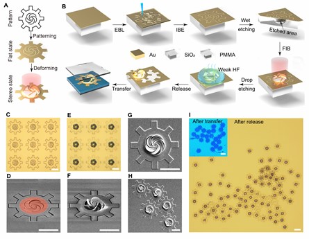 圖2:納米剪紙微型轉子的制備、釋放和轉移。(A)納米剪紙微型轉子的制造流程圖;(b)微型轉子的實驗制備、釋放和轉移示意圖;(C-F)制備的微型轉子光學顯微鏡和SEM圖像;(G-I)釋放和轉移后的微型轉子SEM圖像和光學顯微鏡圖片。比例尺:(C-H):5 μm,(I):10 μm。