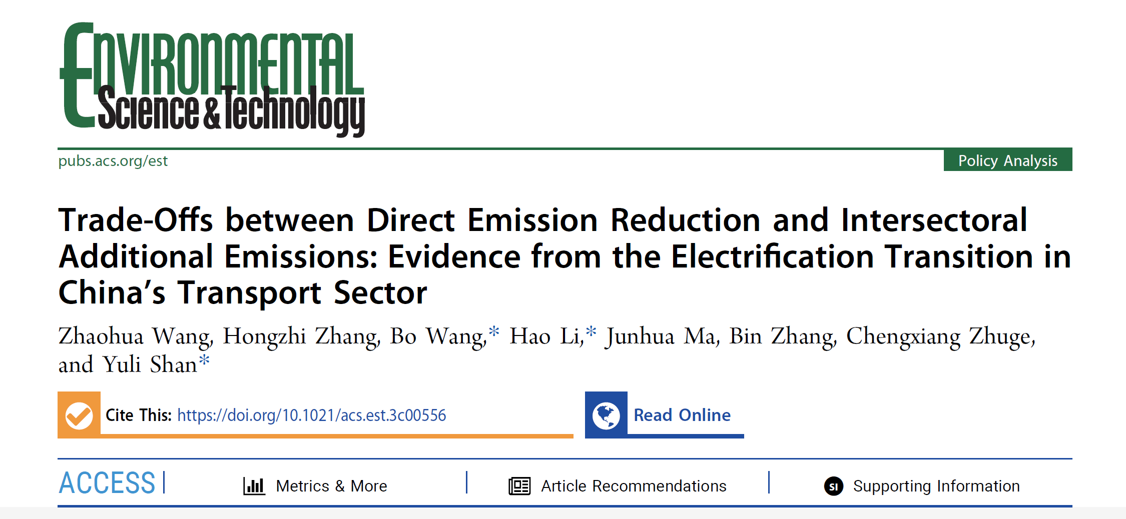 Zhaohua Wang, Hongzhi Zhang, Bo Wang, Hao Li, Junhua Ma, Bin Zhang, Chengxiang Zhuge, and Yuli Shan. Trade-Offs between Direct Emission Reduction and Intersectoral Additional Emissions: Evidence from the Electrification Transition in China’s Transport Sector. Environmental Science & Technology Article ASAP DOI: 10.1021/acs.est.3c00556.