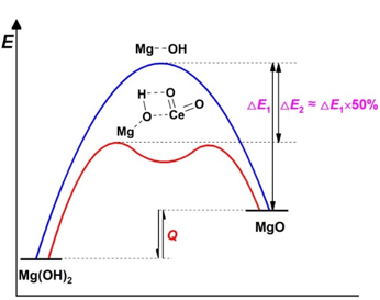 利用SEM,HRTEM,XRD和XPS等分析測(cè)試技術(shù),研究了材料的組成和微觀結(jié)構(gòu),初步揭示了強(qiáng)化儲(chǔ)熱過程的催化機(jī)理和添加物對(duì)材料結(jié)構(gòu)的影響(圖3和4)。根據(jù)脫水動(dòng)力學(xué)實(shí)驗(yàn)數(shù)據(jù),作者推演了可能的動(dòng)力學(xué)機(jī)理函數(shù)和動(dòng)力學(xué)方程(式1和2);動(dòng)力學(xué)方程可以支持后續(xù)的數(shù)值模擬和儲(chǔ)能設(shè)備的設(shè)計(jì)。脫水反應(yīng)活化能的測(cè)試和計(jì)算結(jié)果表明活化能(E)和Ln A分別降低51%和50%(圖5);因此,硝酸鈰和氫氧化鋰通過降低活化能和對(duì)材料微觀結(jié)構(gòu)的影響顯著提升氫氧化鎂的儲(chǔ)放熱性能。