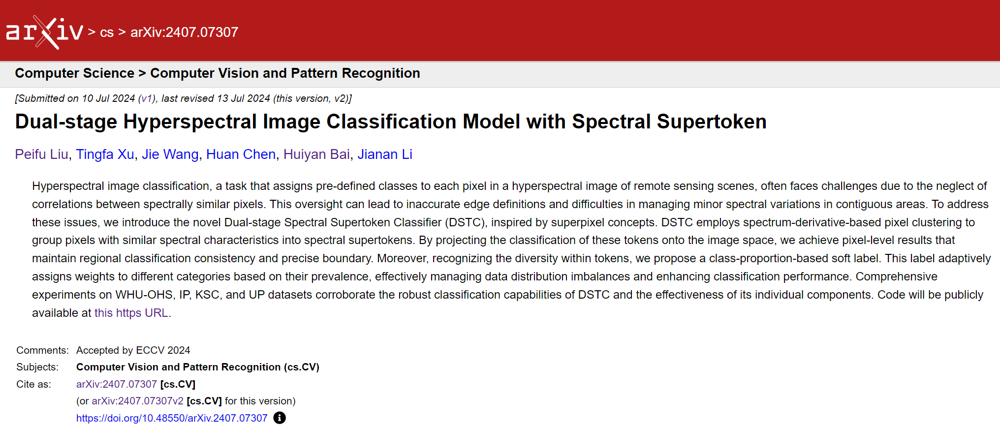 論文詳情:P. Liu, T. Xu, J. Wang, H. Chen, H. Bai, and J. Li, Dual-stage Hyperspectral Image Classification Model with Spectral Supertoken, in European Conference on Computer Vision, doi: 10.1007/978-3-031-72754-2_21.
