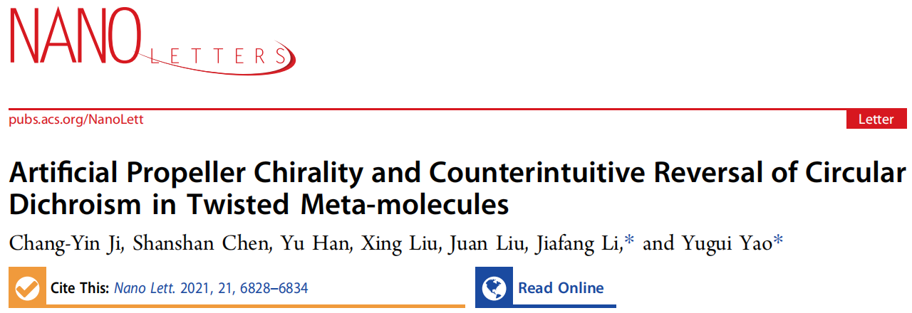 文章信息(#為共同一作;*為通訊作者):Chang-Yin Ji, Shanshan Chen, Yu Han, Xing Liu, Juan Liu, Jiafang Li,* and Yugui Yao*, “Artificial Propeller Chirality and Counterintuitive Reversal of Circular Dichroism in Twisted Meta-molecules”, Nano Letters 21, 6828-6834 (2021).