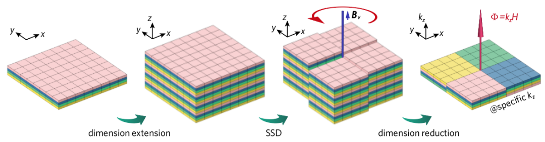 研究團隊設計了一種特殊的拓撲缺陷結構,即階梯型螺位錯(step screw dislocation,SSD),引入了局域的贗磁通。參考下圖,通過對原有的二維有限晶格實施維度擴展(dimensional extension)、引入拓撲缺陷(階梯型螺位錯)、維度縮減(dimensional reduction)三個關鍵步驟,建立了依賴于晶格動量的等效二維晶格。