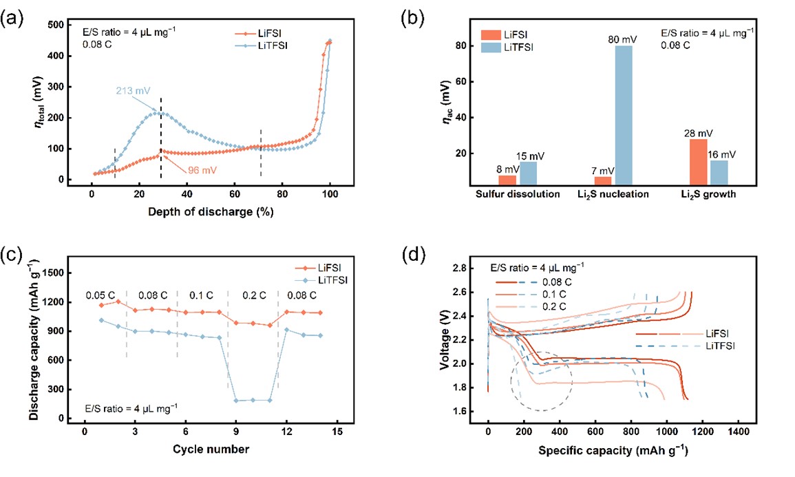 圖4. 使用LiFSI電解液的貧液鋰硫電池動(dòng)力學(xué)分析和全電池性能。