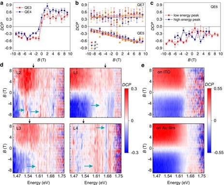 圖3.手性等離激元晶格L1處QEs的圓偏振分辨的磁光光譜(磁場方向垂直于樣品表面)。