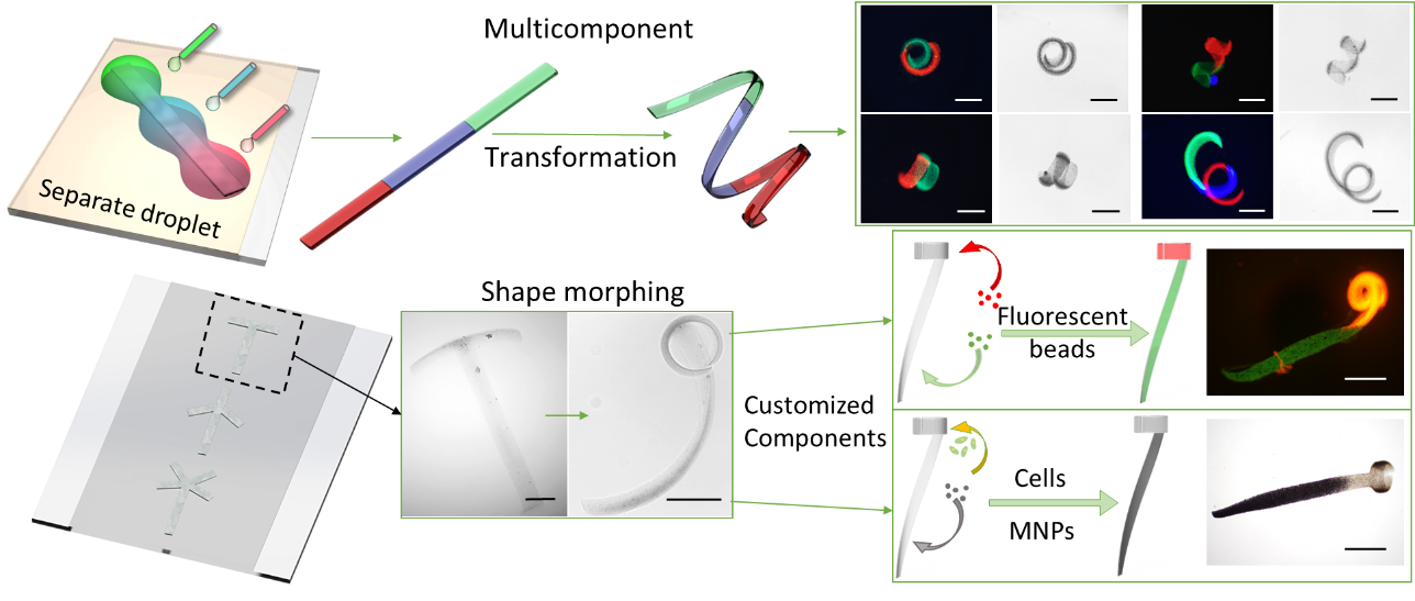 通過模塊化軟體微機器人制造方法,團隊設計了經(jīng)典的條狀微機器人本體結構,并為其不同模塊區(qū)域搭載了磁性納米顆粒、造影劑(如微泡和熒光納米顆粒)、功能性細胞、靶向藥物等不同物質,使其能夠兼具磁驅動、封閉空間顯影反饋、靶向作業(yè)等性能。通過賦予微機器人本體不同模塊特定的形變模式,使其能夠感知生物活體環(huán)境中變化的體液離子濃度與pH值,發(fā)生局部區(qū)域同軸、異軸形變并通過磁驅動模仿毛蟲蠕動、魚類擺尾,實現(xiàn)運輸、投遞、移植、回收、降解等多序列復雜任務,有望在未來個性化靶向醫(yī)療中大展拳腳。